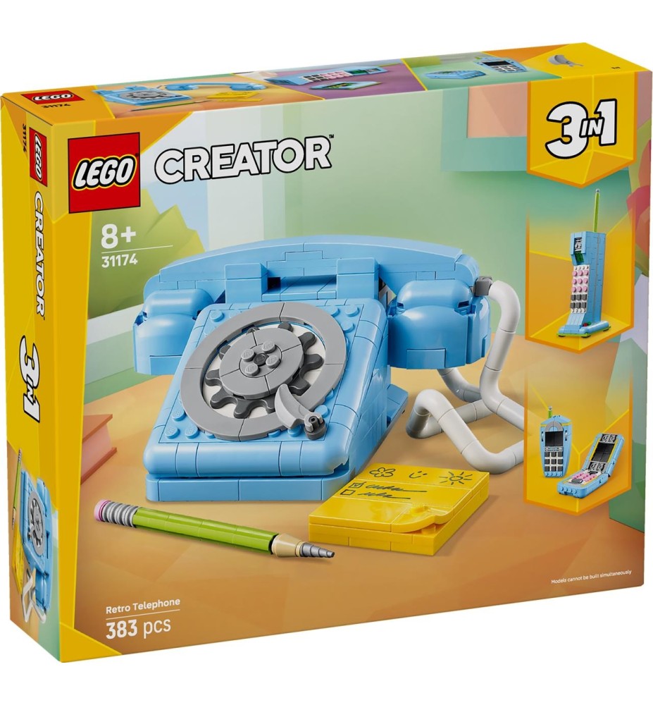 ¡El elegante set de construcción LEGO® Creator 3en1 Teléfono Retro (31174) hará retroceder en el tiempo a los adultos nostálgicos y los peques creativos a partir de 8 años! Incluye un entrañable teléfono de los años 60 de juguete con auricular quese levanta, cable flexible, disco de marcar giratorio y función de resorte para colgar la llamada. Este set de decoración retro cuenta también con un lápiz para construir y un taco de notas adhesivas personalizable con 3 cubiertas que llevan distintos mensajes. Este impresionante set LEGO ofrece 3 opciones de construcción diferentes con los mismos ladrillos: un teléfono de la década de 1960, un teléfono de la década de 1980 en una base de carga o 2 teléfonos de la primera década de siglo XXI. Los sets LEGO Creator 3en1, fantásticos como regalo para niños y niñas, proponen 3 alternativas de construcción en cada caja, inspiradas en algunas de sus mayores pasiones. Los modelos no se pueden construir simultáneamente.