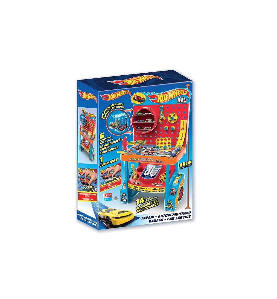 Hot Wheels - Garaje y Banco de Herramientas, un espectacular garaje con banco de herramientas de Hot Wheels Gracias a sus ruedas, puedes llevártelo donde quieras y jugar mientras arreglas tus coches. Incluye 38 herramientas, ¡todo lo que necesita un amante de la mecánica como tú! También cuenta con un circuito en la mesa y espacio para 6 vehículos Hot Wheels, NO incluidos. Medidas: 80 x 45 x 40 cm.