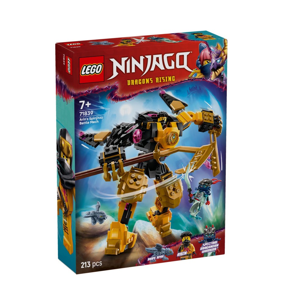 Los fans de los ninja a partir de 7 años podrán interpretar emocionantes escenas de la temporada 3 de la serie para televisión NINJAGO®: El Renacer de los Dragones con el juguete LEGO® NINJAGO Meca de Batalla Spinjitzu de Arin (71839). Este set deconstrucción incluye un meca NINJAGO con brazos y piernas articulados, torso giratorio, pecho que se abre para colocar dentro una minifigura y 2 grandes espadas. Los peques también pueden crear su meca definitivo intercambiando algunas partes del cuerp o del Meca de Batalla Spinjitzu de Arin con las de los mecas personalizables de la gama NINJAGO de 2024 (a la venta por separado): Meca Elemental de la Tierra de Cole (71806), Meca Elemental Tecno de Sora (71807), Meca Elemental del Fuego de Kai (71808) y Meca de Poder Elemental de Lloyd (71817). Este set de juguetes ninja cuenta con 2 minifiguras: Arin (con una catana de cristal) y un guerrero Dragónido Espectral (con una espada), así como con un modelo de Riyu bebé.
