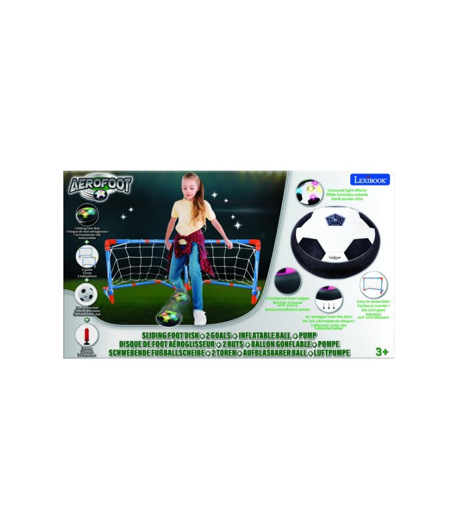 Juega dentro y fuera de casa con el disco de fútbol aerodeslizador, balón de fútbol hinchable y 2 porterías incluidas. ¡Efecto aerodeslizador super dinámico! El aire escapa del disco y proporciona un juego rápido y emocionante. Se desliza fácilmente sobre cualquier superficie plana. Bordes de espuma antichoque para proteger las paredes y los muebles. Efectos de luz para jugar incluso en la oscuridad. Incluye 2 porterías: ¡fácil de montar y cómodo de transportar! Bordes de espuma antichoque para proteger paredes y muebles. Incluye balón de fútbol hinchable de 11 cm y bomba. Batería recargable y cable USB incluidos.