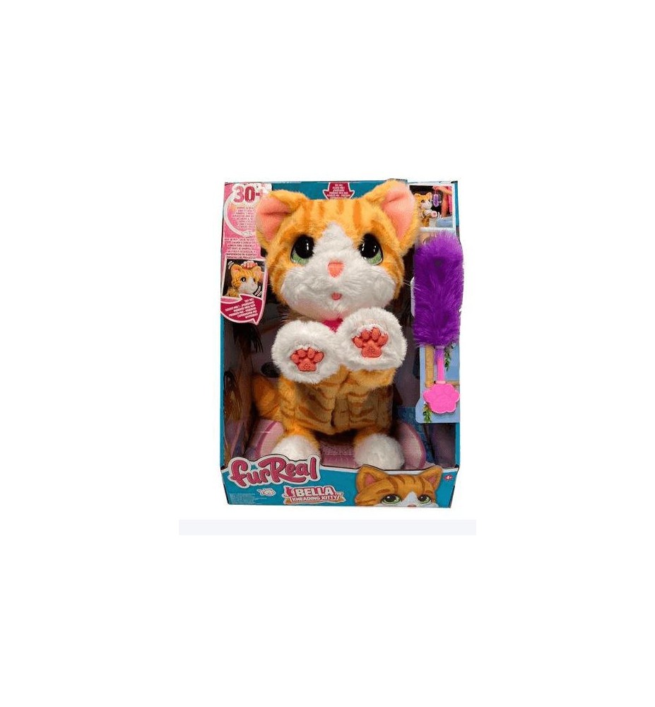Conoce a Bella, un gatito tan suave como encantador que reacciona al cariño: ríe, maúlla, ronronea y hace movimientos de amasado durante 30 segundos al acariciar su cabeza. Cuando se acerca un juguete accesorio peludo a su nariz, ¡se incorpora sobre sus patas traseras para jugar!