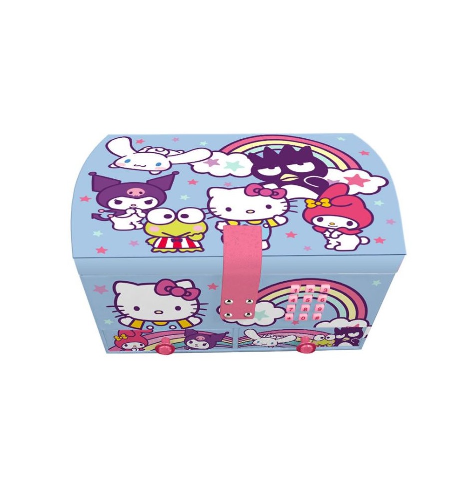 Incluye: 1 joyero secreto de la serie animada Hello Kitty And Friends de color azul con música, código de acceso, dos cajones exteriores, un espejo interior, un gran espacio interior y un organizador con tres espacios.