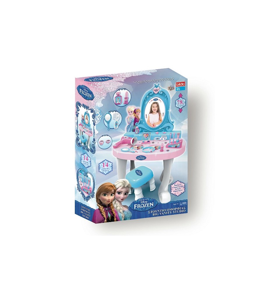 Tocador con todo tipo de detalles de Frozen. Tiene un espejo donde podrás mirarte y viene con 14 accesorios para peinarte, maquillarte, etc.. Altura aprox. 78cm.