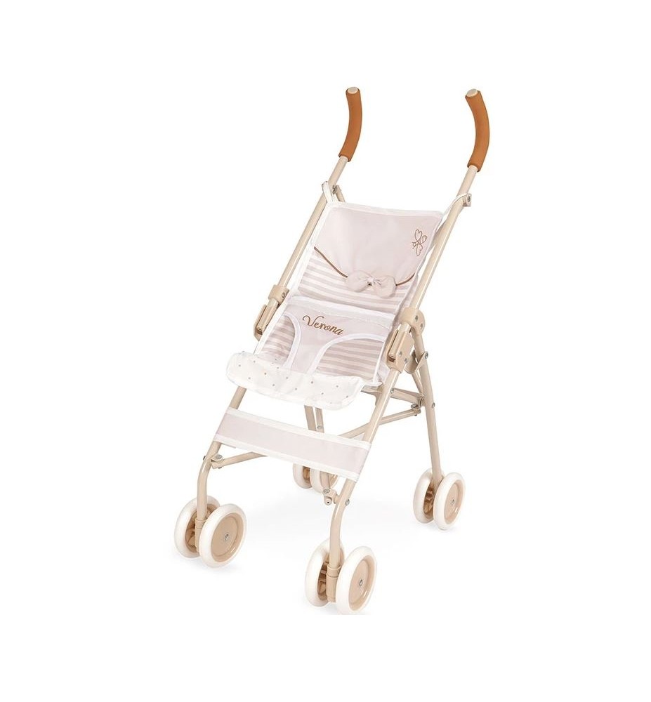 El pack incluye: Silla de muñecas grande de color blanco y beige con estampado especial de la linea Verona, estructura plegable, ruedas con cubierta de foam silencioso, asas acolchadas y cinturón de seguridad para el bebé.