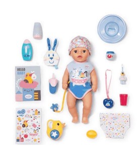 Además se incluye un set de **13 accesorios** que permiten ambientar cada situación de juego: biberón, pañales, ropa, orinal y más, junto con un certificado de nacimiento para que el niño se sienta responsable del cuidado del muñeco.
