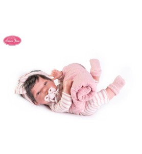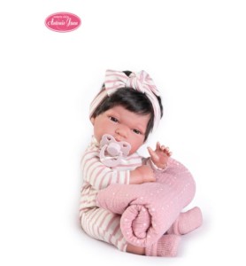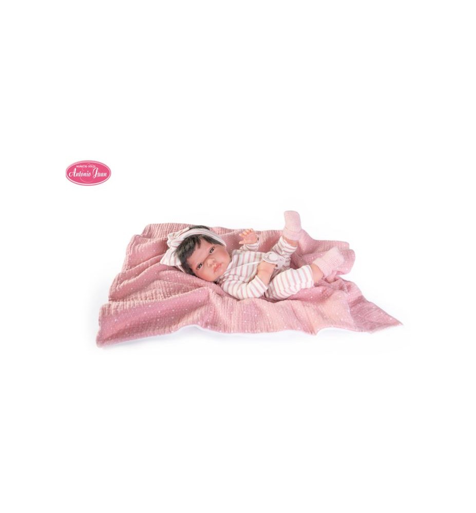 Bebé con expresión realista y un tamaño perfecto para acompañarte allá a donde vayas. Toneta descansa sobre su manta y le encanta que peines su precioso pelo moreno y le pongas su diadema a juego con su ropita.