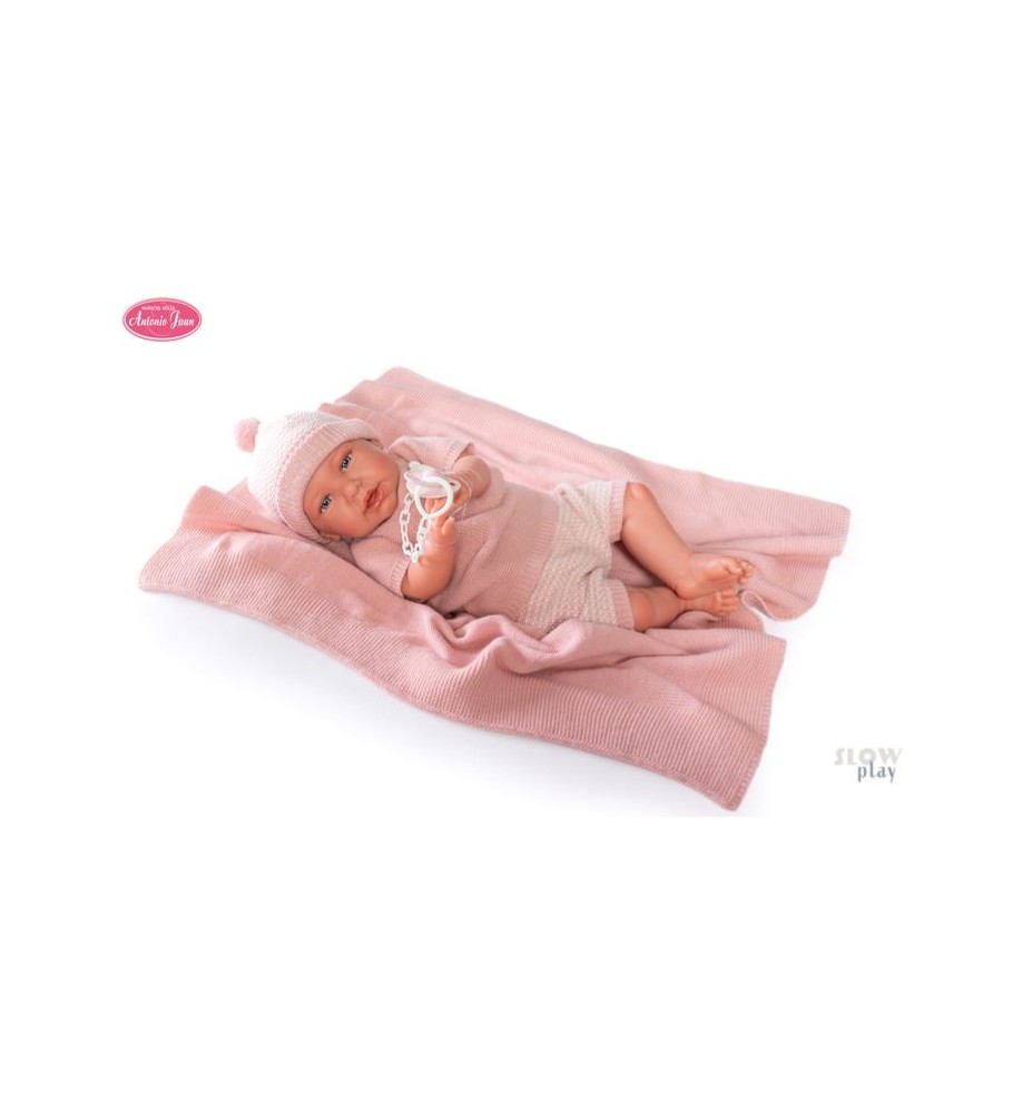 Mi Primer Reborn son muñecas realistas con las que podrás disfrutar como de un bebé casi real. Fíjate en su manicura, el peso o la babita que le asoma entre los labios Una elección perfecta pensando en el juego de los más pequeños. Mi Primer Reborn Daniela con toquilla es un bebé adorable que lleva un conjunto preciosos de color rosa. Con su gorro y su toquilla está encantada de poder jugar contigo.No le falta detalle en sus complementos. Además lleva pañala como un bebé de verdad. Pesa 1730 gr. y mide 52 cm. Incluye un libro de familia para tu Reborn de Muñeas Antonio Juan.