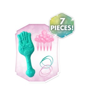 Incluye: 1 cabeza para peinados, 1 cepillo, 1 peine decorativo y 4 gomas elásticas.