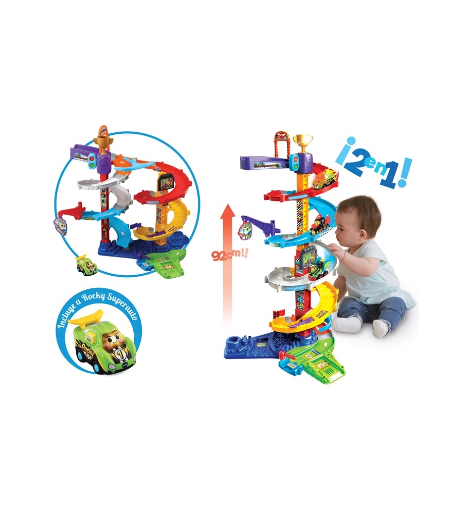 ¡Una gran torre circuito en espiral con dos recorridos distintos y un divertido superbólido para bajar a toda velocidad!