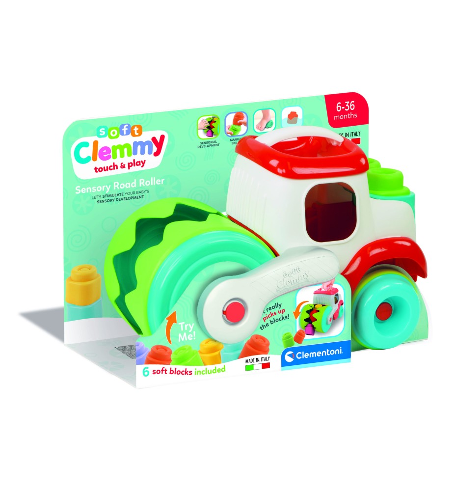 Un simpático vehículo sensorial con un rodillo comeladrillos con el inconfundible diseño de Clemmy. El vehículo cuenta con un montón de texturas y diferentes materiales blanditos de Clemmy que ayudan a estimular la percepción táctil El bebe se divierte haciendo que el suave rodillo se coma los bloques, construyendo montones de torres, introduciendo los bloques por la ventanilla y recuperándolos abriendo el maletero trasero. Los bloques Clemmy son blanditos, seguros y lavables. Favorecen el desarrollo sensorial, motor y cognitivo del bebe.