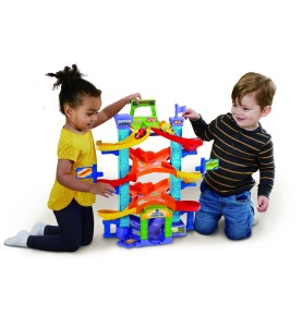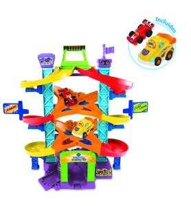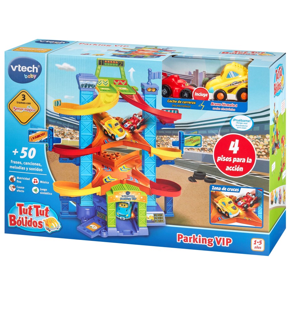 Parking VIP de Tut Tut Bólidos con doble posición de salida para lanzar a los dos coches incluidos y ver quién gana.